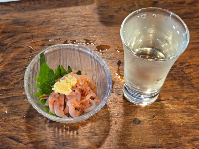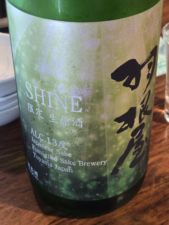 羽根屋 SHINE(シャイン) 無濾過生原酒(富山)…別料金。フルーティー辛口。普段の羽根屋より落ち着いてる?料理(生桜えび)と合わせるとバランスのよさがわかる。羽根屋は間違いない。