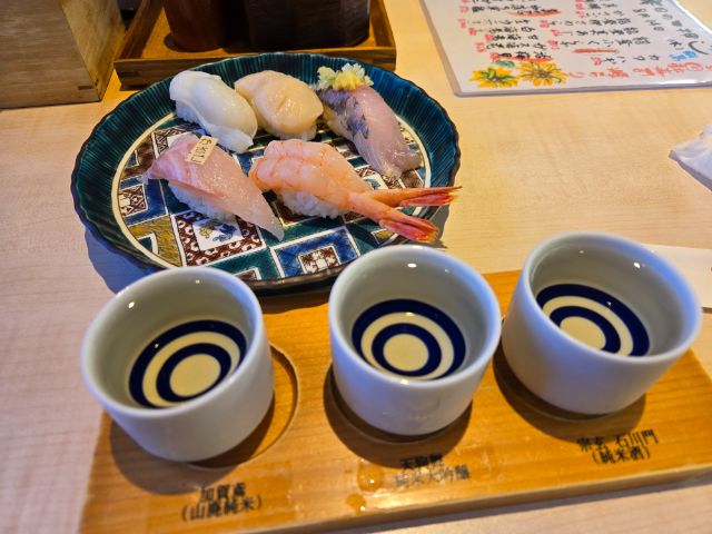 金沢駅の回転寿司屋「輝らり」で頼んだ飲みくらべセット天狗舞 純米大吟醸(石川)…どっしり系でもキレイにまとまってて美味しい日本酒のイメージがこれ。