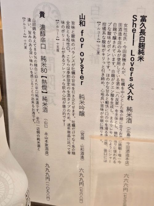 山和 for oyster 純米吟醸(宮城)…すっきり辛口、ほのかにマスカット感。余韻がある。しっかりと牡蠣に合う!